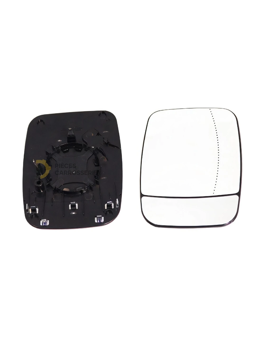 Techniquement, cette glace support se présente comme un élément robuste et précis, spécifiquement conçu pour la structure du rétroviseur droit du Renault Trafic III. Elle remplace efficacement la surface réfléchissante tout en offrant une résistance accrue aux vibrations et aux chocs fréquents sur la route. Ce vitrage est compatible avec les mécanismes d’origine, sans affecter ni la motorisation ni la commande électrique du rétroviseur. Son design respecte strictement les dimensions et les contraintes imposées par les phases 1 et 2 du Trafic III, assurant ainsi une parfaite harmonie avec le cadre d’origine et une visibilité optimale pour le conducteur.